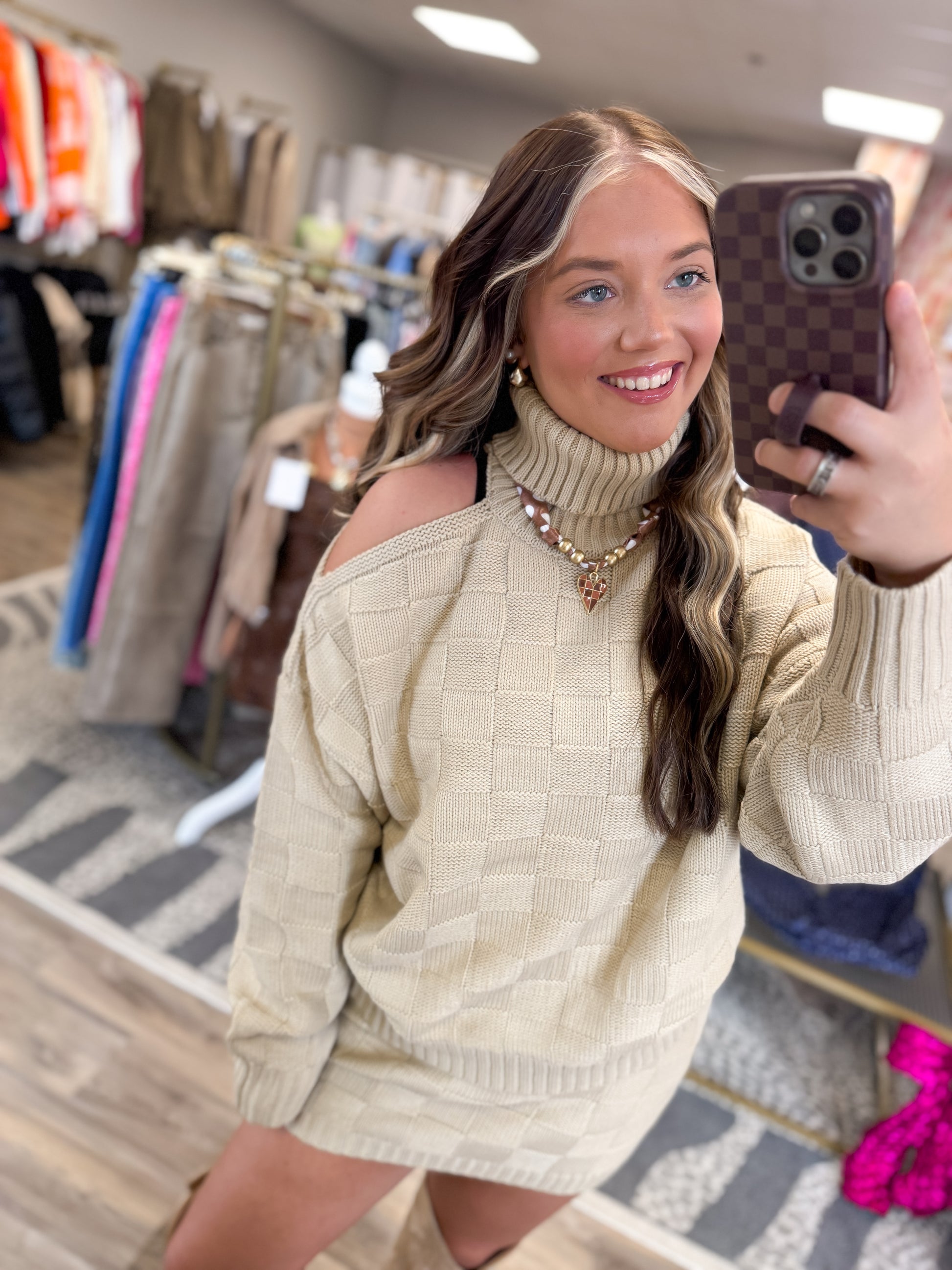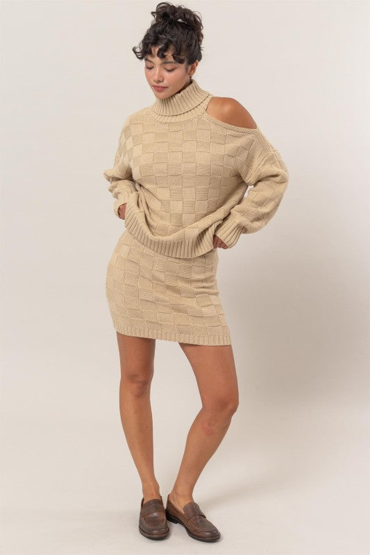 The perfect checkered detailing. Super stretchy. Sweater features a cutout in ONE shoulder. Skirt is a decent length.