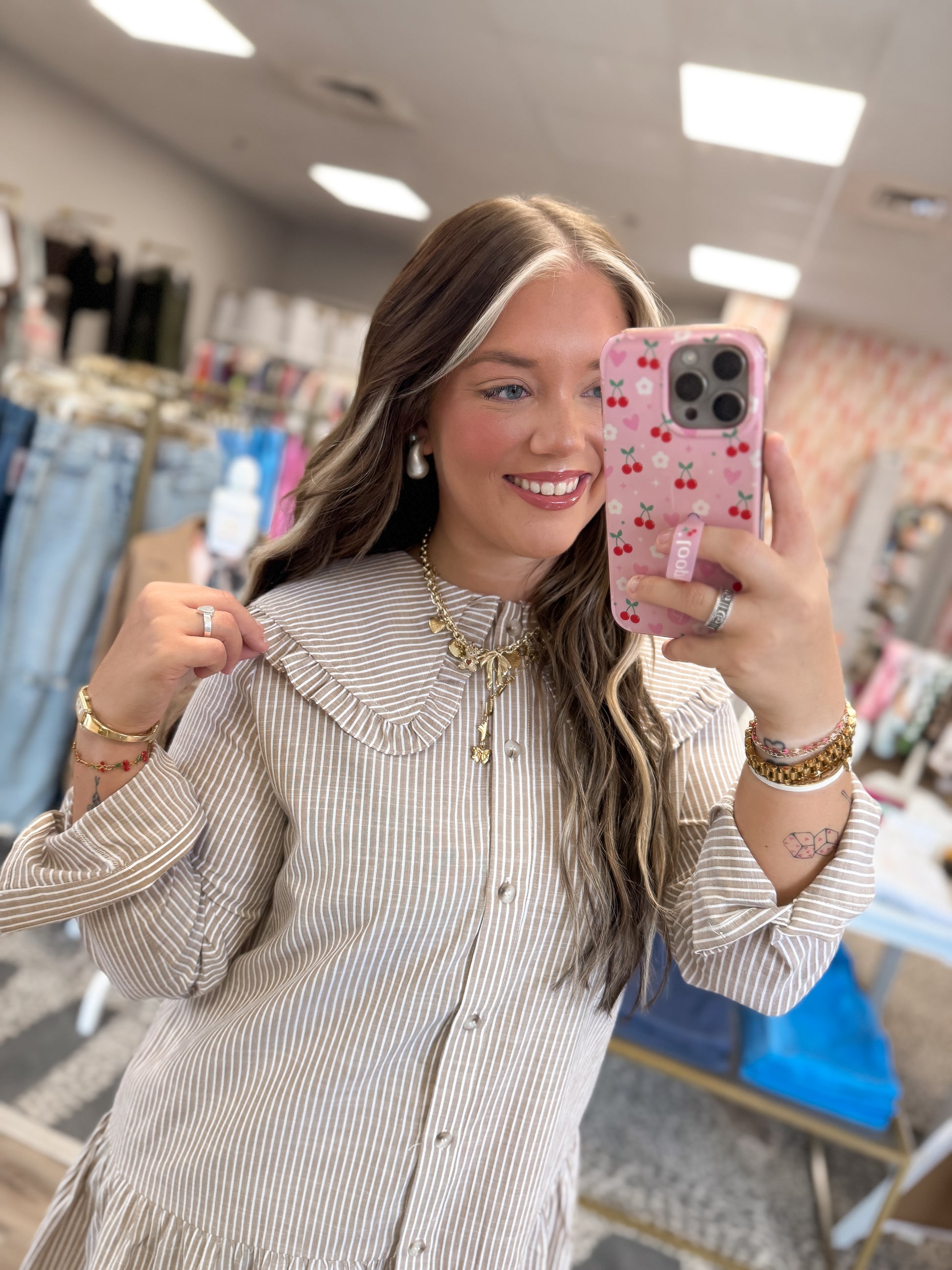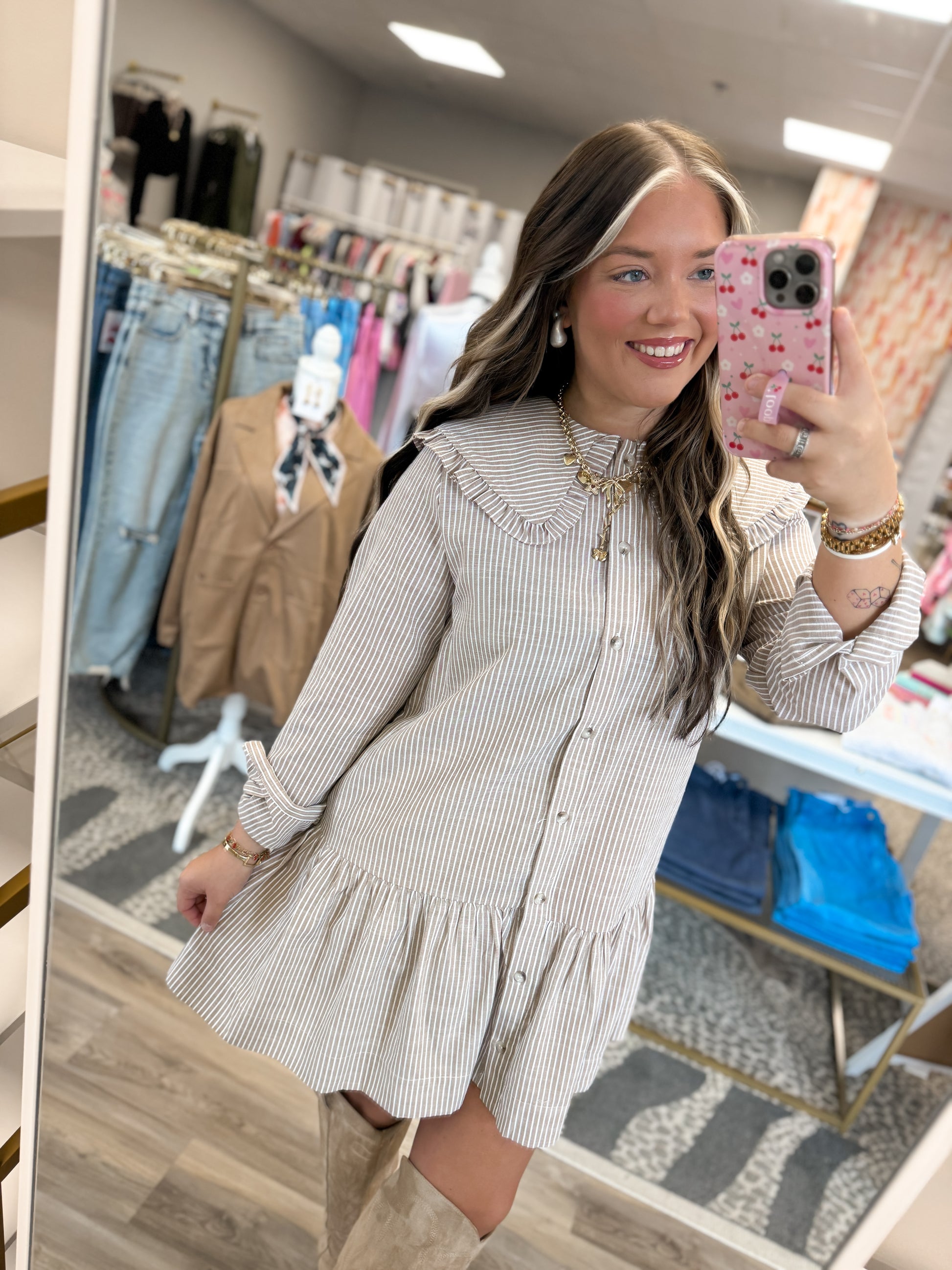 Stripe button down dress. True to size fit. Model wearing size Large.