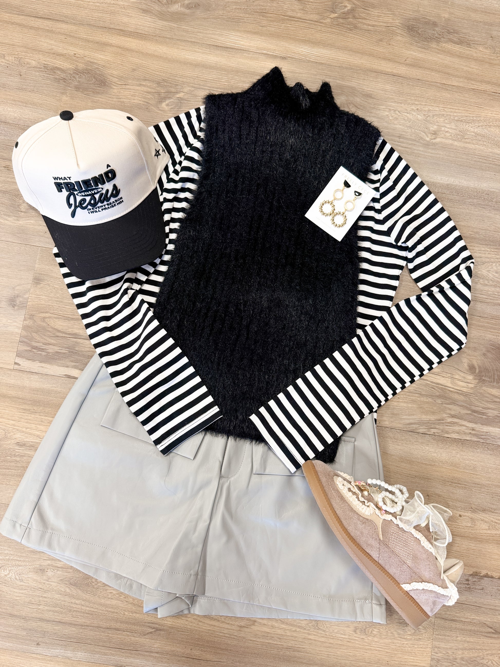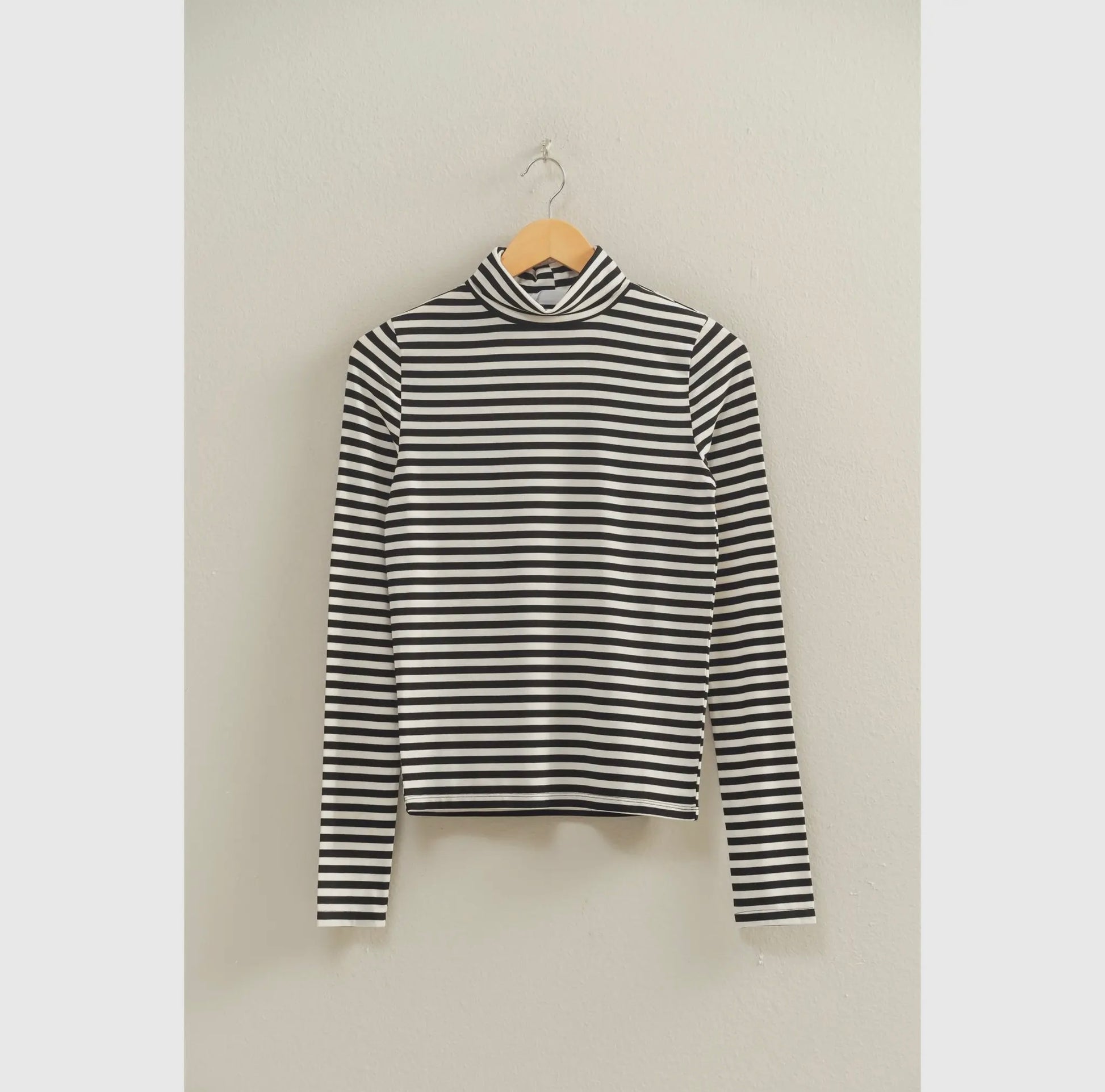 Stripe turtleneck. Very stretchy. Regular waist length. Size down for a more fitted look.