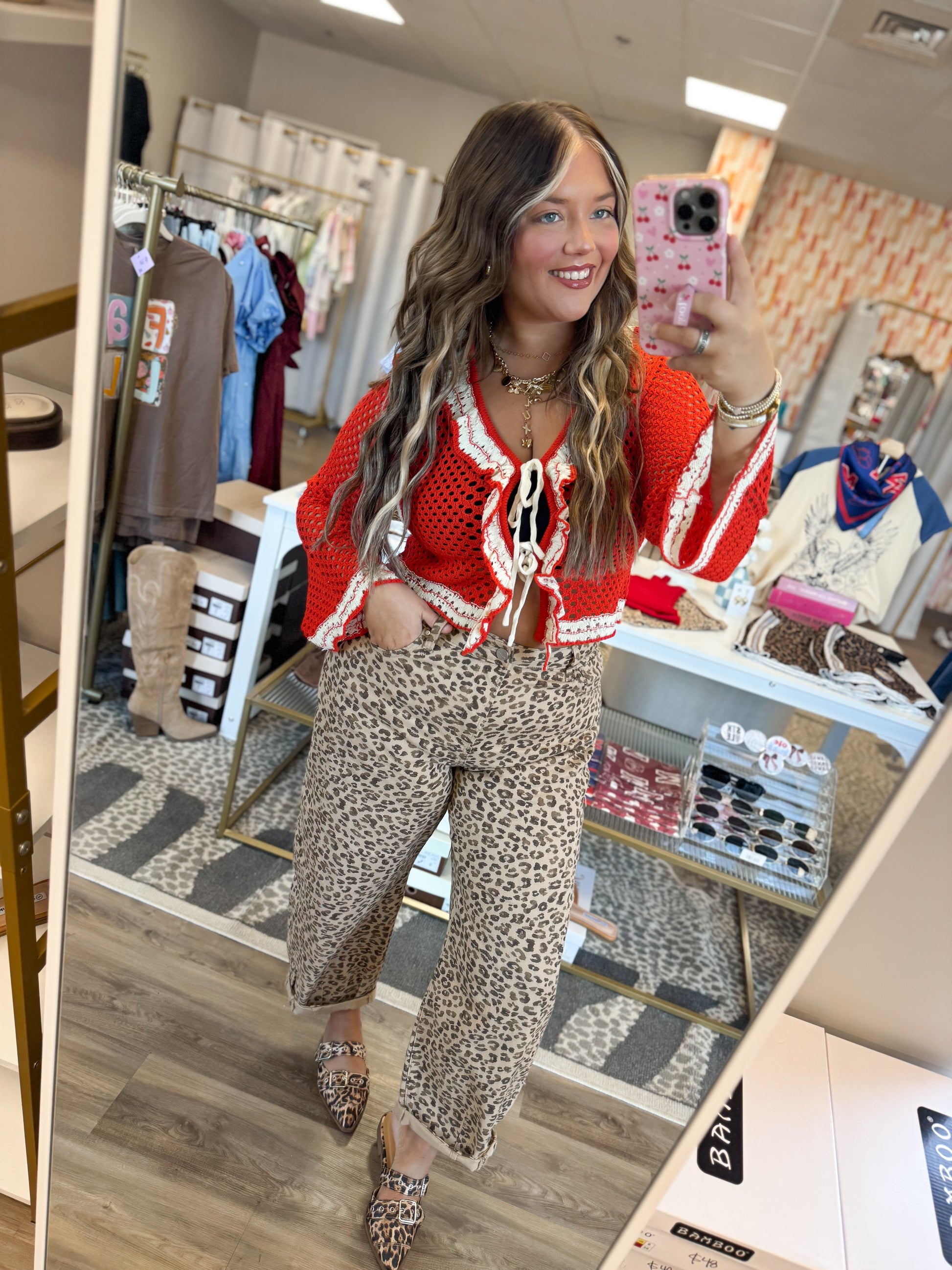 Stylish barrel jeans in a beautiful cheetah print! Slightly stretchy. Model wearing size 11.