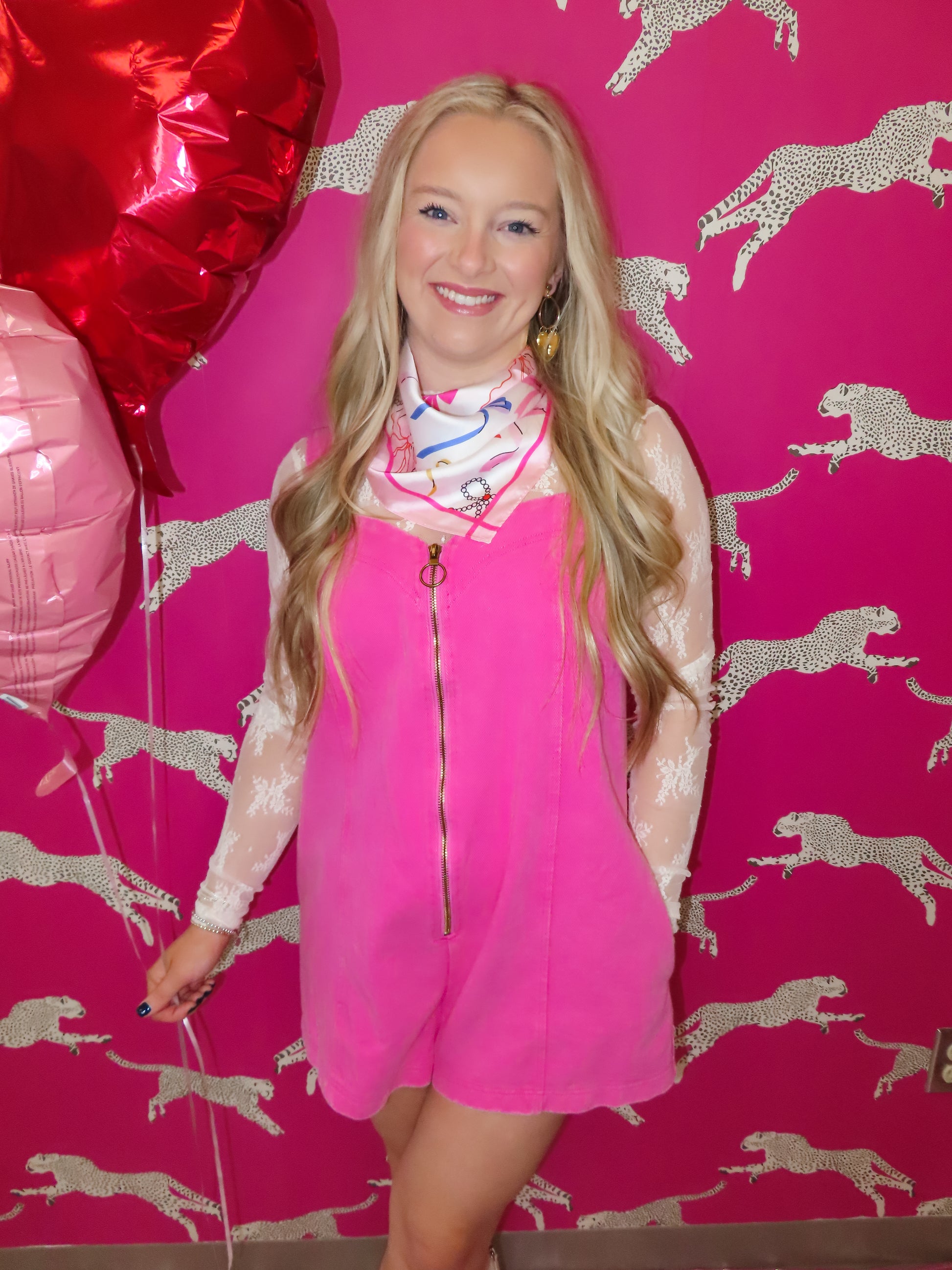 Pink denim romper. Adjustable straps. Zipper closure down the front middle. True to Size fit with room to spare. Model is 5’2 and wearing size Small.