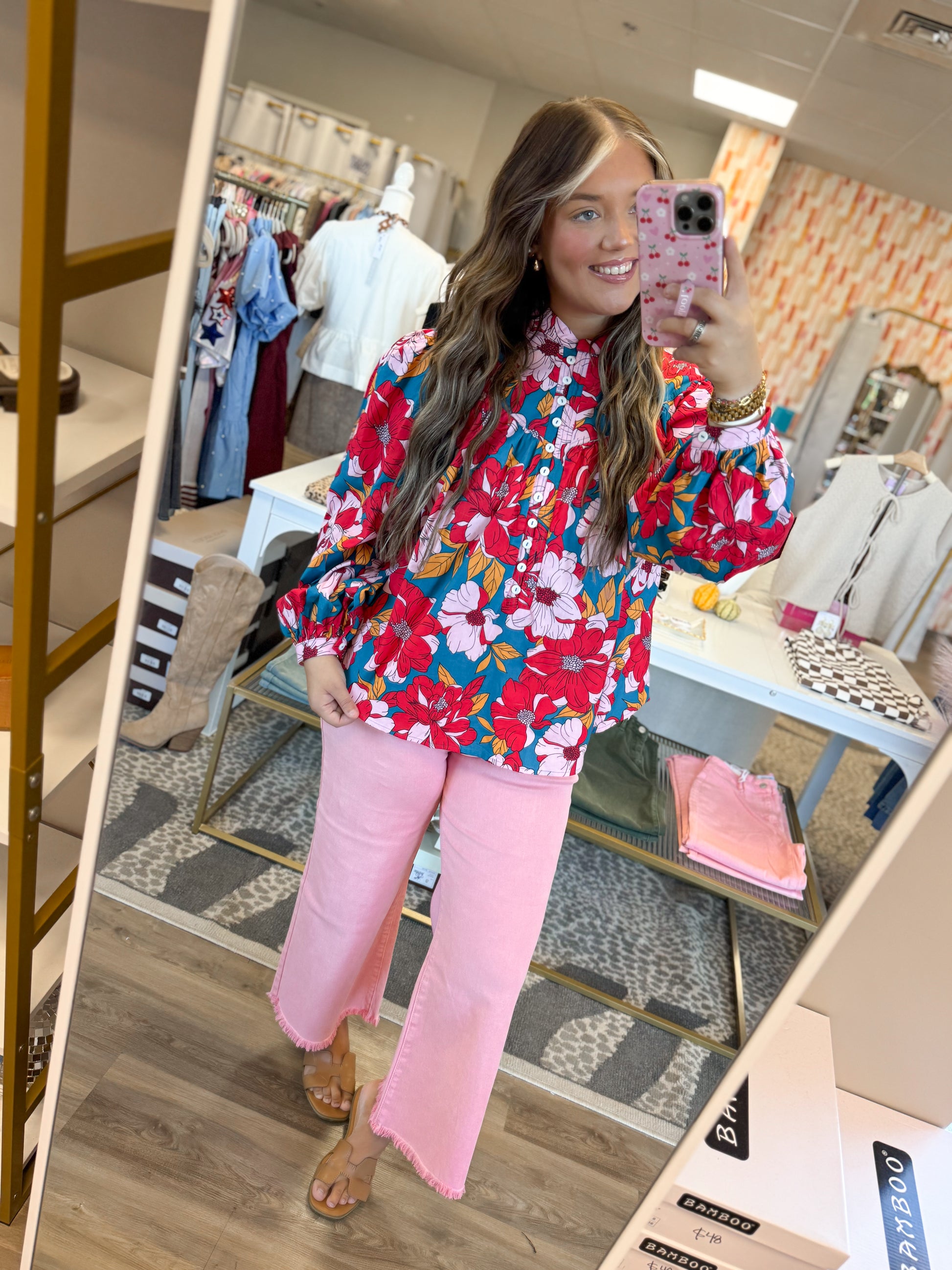 Beautiful floral top. Thin material. Button down closures. Oversized fit. Model wearing size Small.