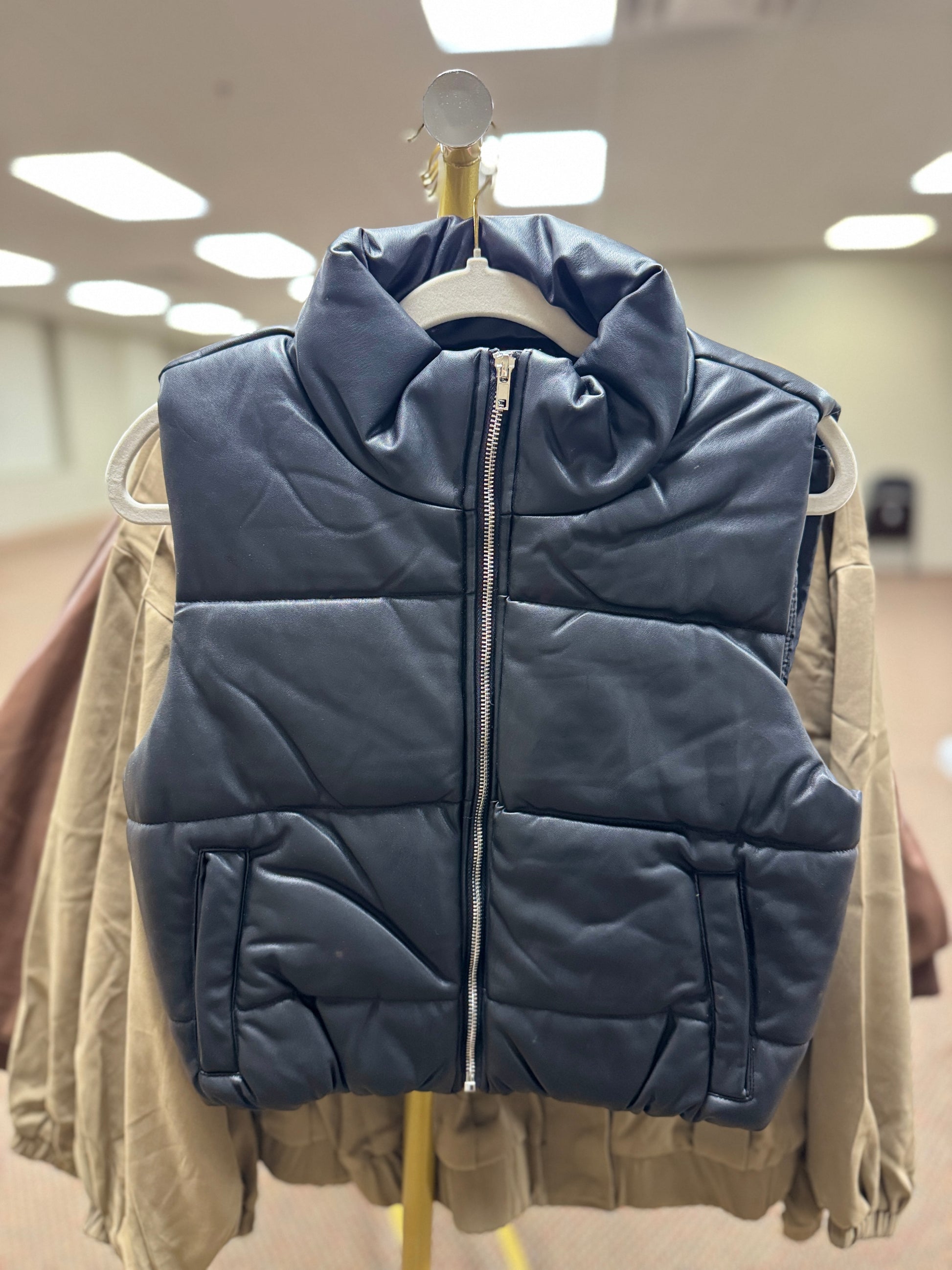 LOVE!!! Cropped faux leather puffer vest with pockets and front zip. Pairs well with anything! Recommend sizing up one size for a more loose fit.