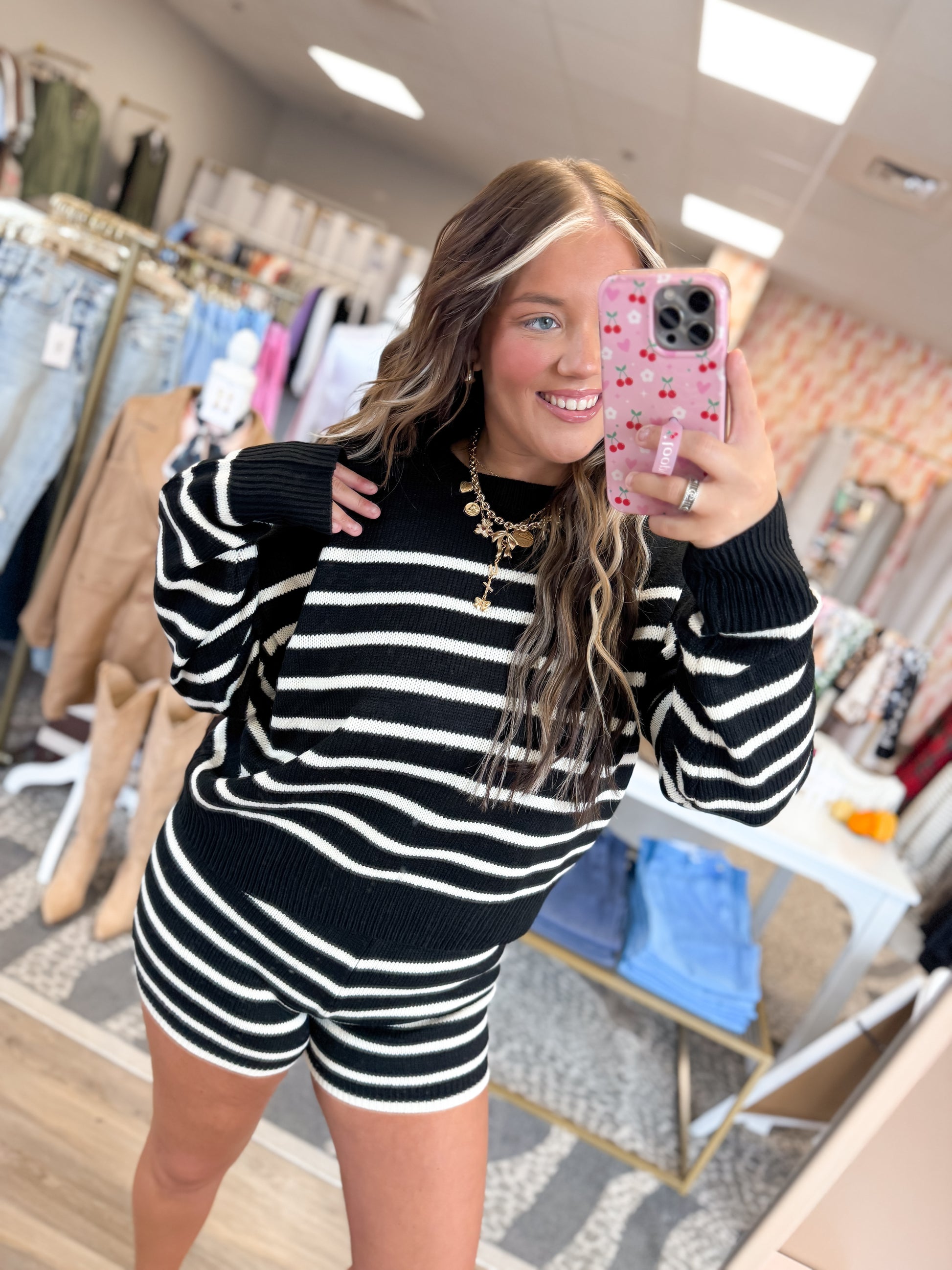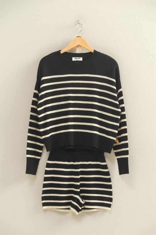 Black and cream color. Soft knit like material. Elastic band shorts. No pockets.